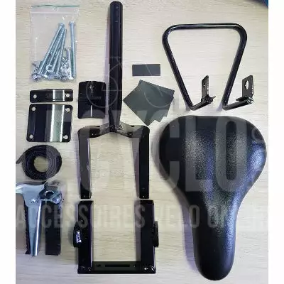 Cette selle de vélo est spécialement conçue pour être montée sur un cadre de vélo femme. Ce type de vélo est généralement dépourvu de tube horizontal appelé « top tube » et n’est donc pas compatible avec les selles de cadre classiques. Ce siège permet ainsi de faire une place à un enfant entre le guidon et la selle du conducteur.