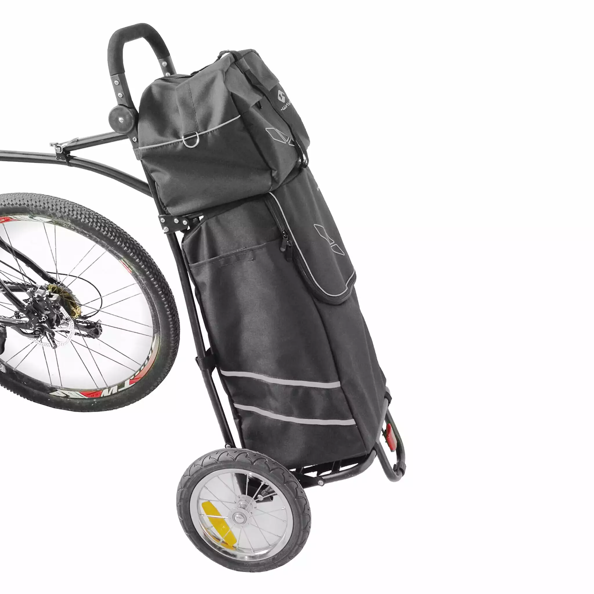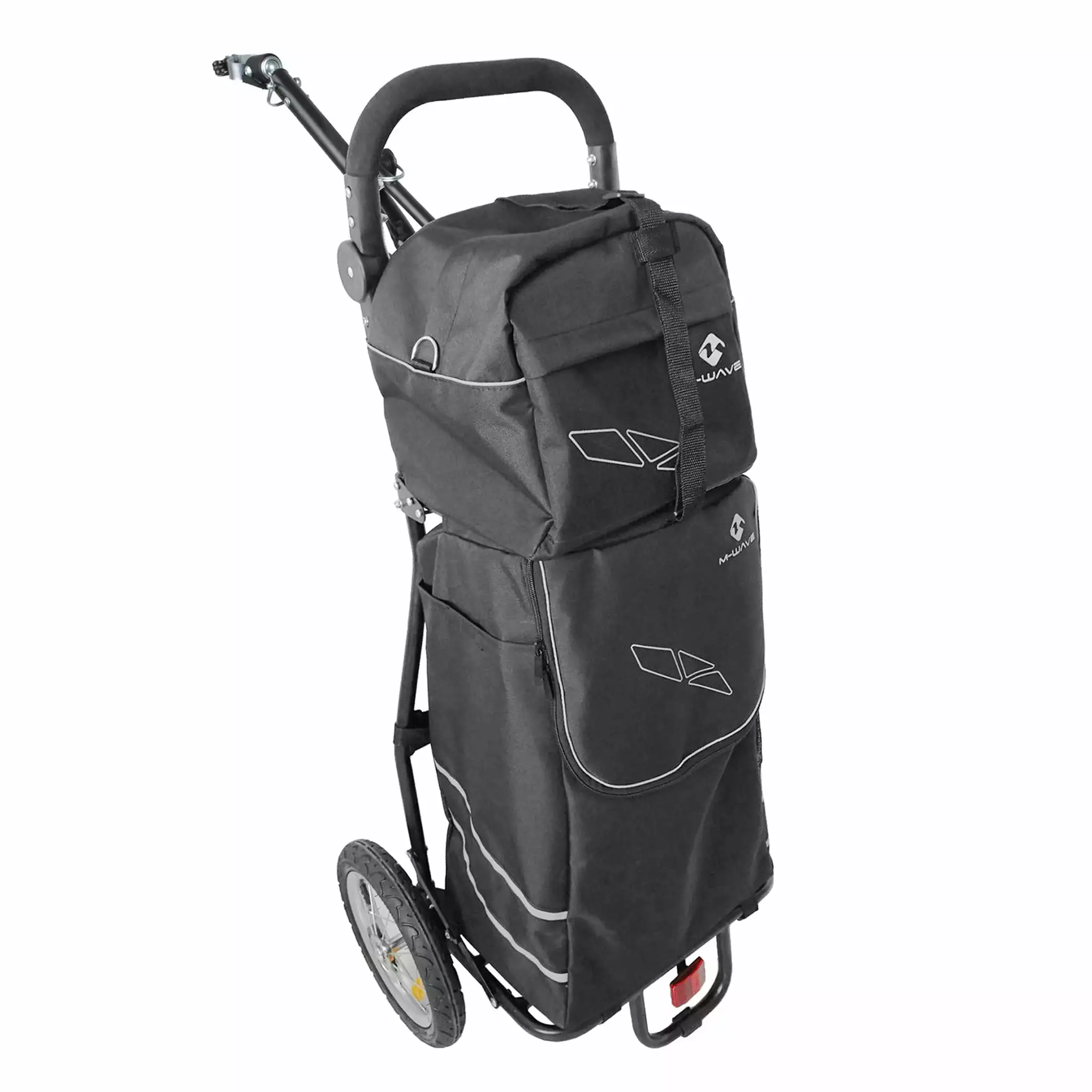 M-Wave propose son chariot polyvalent, pour accompagner le cycliste dans ses activités du quotidien, à pied comme à vélo. En effet, le chariot M-Wave s’utilise soit avec une anse pour le tracter à pied, soit avec une fixation sur tige de selle pour le tracter à vélo. Livré avec deux sacs robustes et volumineux, le caddie M-Wave est idéal pour faire ses courses, à pieds ou à vélo.