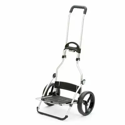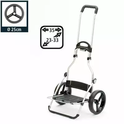 Ce châssis peut tracter une charge pouvant aller jusqu’à 50 kg sans grand effort. Grâce à un système de fixation rapide, ses roues à 3 rayons de diamètre 25 cm s’enlèvent aisément, ce qui simplifie son rangement. Avec une hauteur de 107 cm et un manche pliant, le châssis occupe un minimum d’espace. En aluminium, son poids est de seulement 2,5 kg, ce qui permet de le déplacer facilement et sans peine. Avec un empattement de 50 cm, il se fraye un chemin partout sans difficulté. Grâce au dispositif HangFix, le chariot Royal peut être accroché au caddie de supermarché.