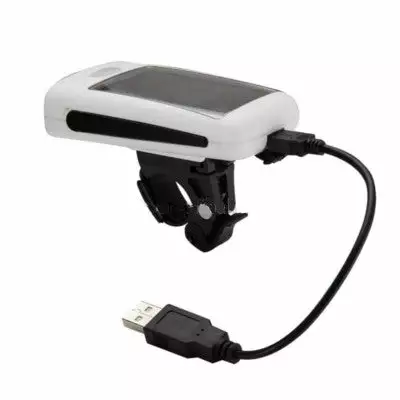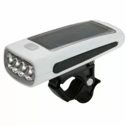 Ce feu avant de vélo a deux modes d’alimentation via un panneau solaire ou via un câble USB. Ces deux modes d’alimentation rechargent ainsi sa batterie interne composée de 3 piles AAA de 750 Mah rechargeables. Un indicateur de batterie faible se trouve sur la face supérieur du feu.