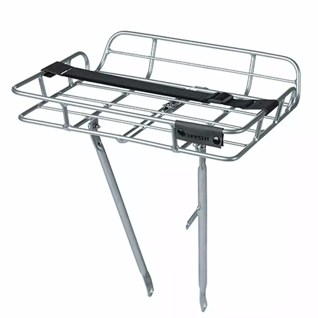 Ce porte-bagages est spécialement adapté aux vélos de 26 et 28 pouces équipés d’une fourche rigide. Il se fixe au niveau du tube de direction et de l’axe de la roue avant. L’axe de la roue doit être de 12/13 mm de diamètre maximum pour pouvoir accueillir les tringles de renfort du porte-bagages. La hauteur des tiges de fixation est de 42 cm. Le porte-bagages est livré avec toute sa visserie de montage et son livret de montage également disponible en PDF ci-contre : Montage porte-bagages Portland Basil. Composé en aluminium, il est solide et peut accueillir une charge maximale de 10 kilos. Une patte de fixation sur une des tringles permet d’y installer un feu comme par exemple le feu avant vintage 3 Leds.