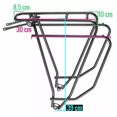Le porte bagage arrière LOGO de la marque TUBUS possède la particularité de pouvoir transporter une charge de 40kg testée par Tubus pour le transport d’affaires et de matéril cyclotourisme ou urbain. (Charge légale de 26 kilos max, voir détails en fin de description*), plutôt que 25kg habituellement, et d’être particulièrement robuste. Il est idéal pour les voyages courts et longs. Le porte bagage LOGO se fixe simplement sur le cadre du vélo. Il s’adapte sur les vélos dont la taille des roues est comprise entre 26 et 28 pouces ou 650 à 700mm.
