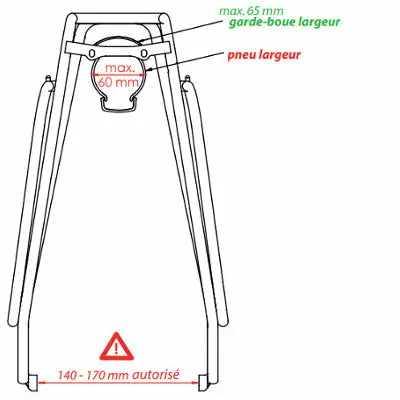 En bas du porte-bagages, l’écartement doit être compris entre 140 et 170 mm. Il ne convient donc pas aux cadres ayant un écartement inférieur des bases inférieures à 14 cm ou supérieur à 17 cm. Retrouvez toutes les dimensions du porte-bagages via le dessin technique du Tubus Classic afin de connaître les compatibilités avec votre vélo.