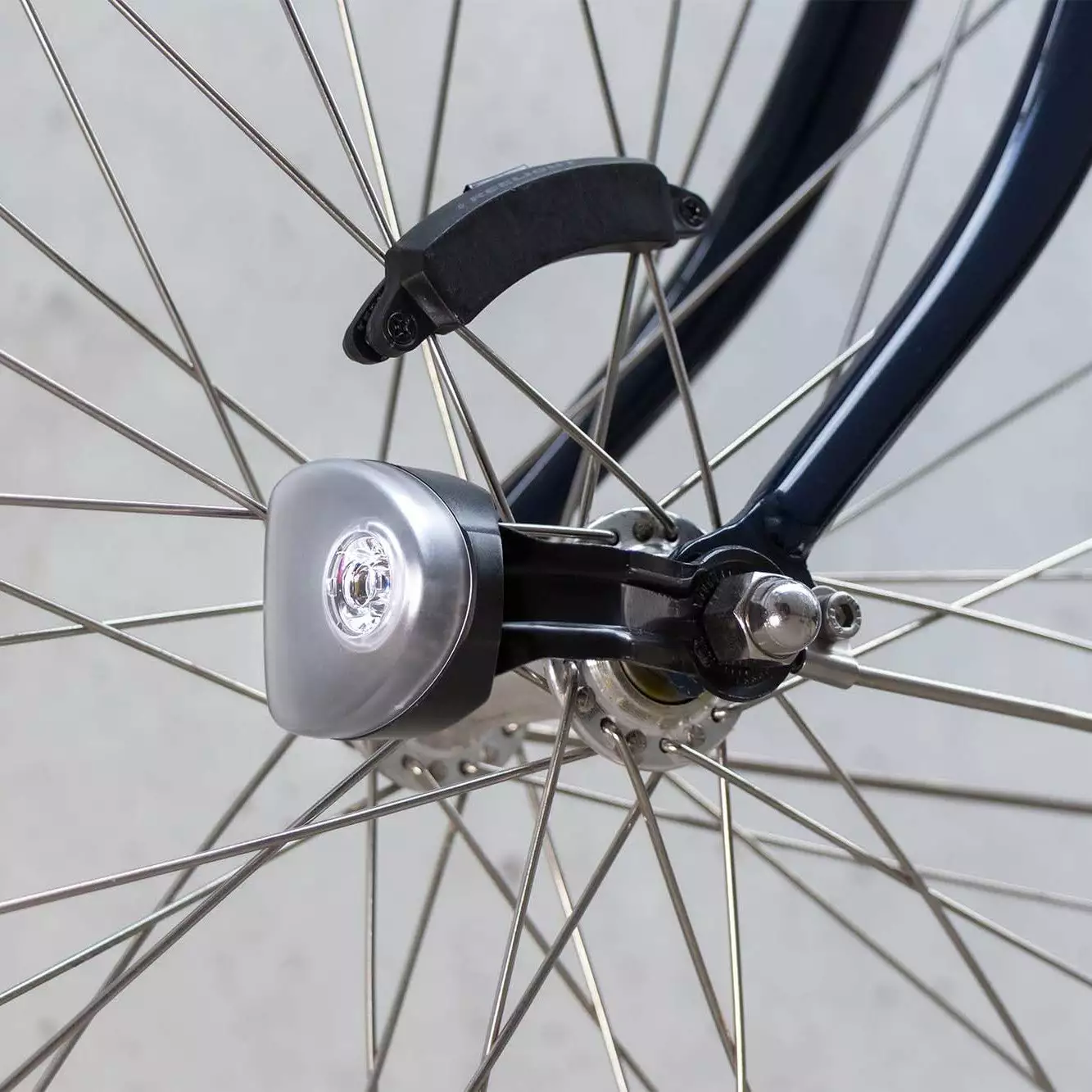 Cette version SL150C à LED offre un allumage continu. Le condensateur intégré se décharge entre 2 passages devant les aimants pour garder allumés les feux avant et arrière. Les feux SL 150 restent allumés quelques secondes à l’arrêt – jusqu’à 10 secondes avec deux magnets sur la roue pour l’éclairage avant.