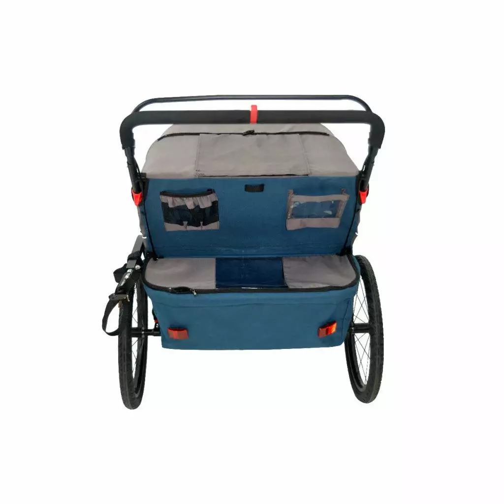 Cette remorque vélo est de coloris noir et bleu. Elle pèse 18 kilos. Elle est montée avec deux roues de 20 pouces ainsi que deux pneus de 20 pouces avec bandes réfléchissantes améliorant la visibilité latérale de nuit.